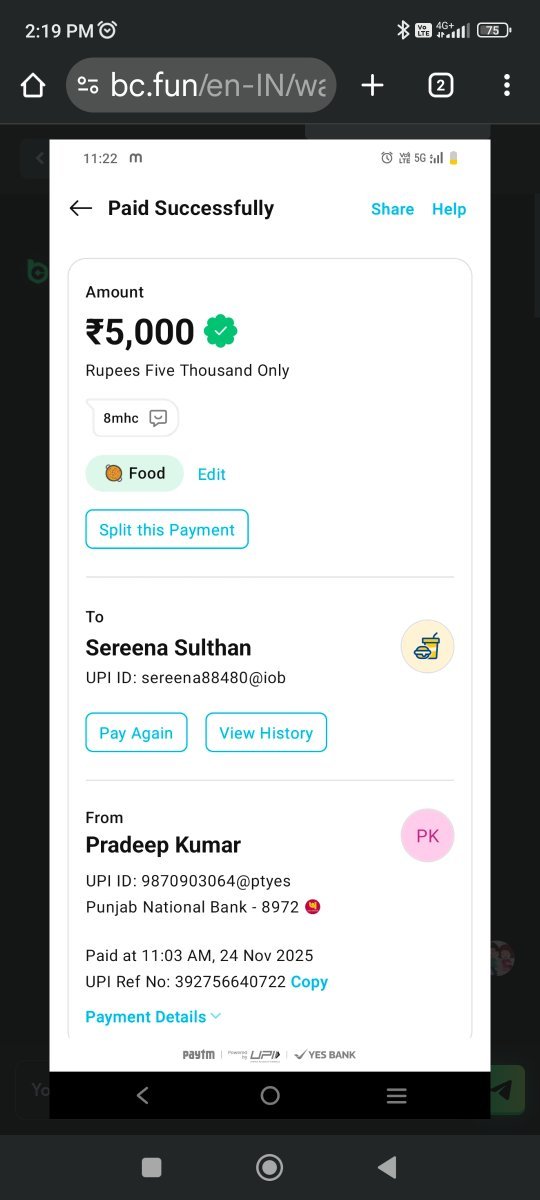 Dear BC.Game Support, Moderators & Admin, I am escalating this publicly because my ticket has been completely ignored for 14+ days. Deposit Details: Amount: ₹5,000 Date & Time: 24-Nov-2025, 11:03 AM IST UPI Ref No: 392756640722 Recipient: Sereena Sulthan (sereena88480@iob) My Bank: Punjab National Bank (Payment 100% successful) Order ID: F-1849648644640825672 Ticket ID: 9491468 (Still showing Pending) Current Status on site: “Under Review – 7-Day Full Manual Credit” → 14 days ho chuke hain, 0 INR credited Screenshots attached: Paytm/UPI successful payment proof BC.Game deposit page showing “Under Review” This is clearly not normal. BC.Game deposits never take 7-14 days for “manual review”. If this ₹5,000 is not credited to my wallet within the next 24 hours, I will be forced to: File official complaint on cybercrime.gov.in Report to RBI Ombudsman for UPI fraud