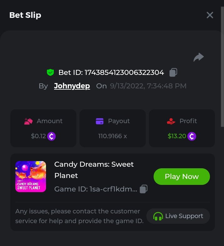 Summary of bets: Wolf Hiding - 92.1x https://bc.game/sd/?sd=10SWD3YOXODYC3 Hot Volcano - 172x https://bc.game/sd/?sd=10SWECOKO7LB0Z Camino de Chili - 43.6x https://bc.game/sd/?sd=10SWN4USZGTBF7 Candy Dreams: Sweet Planet - 110.9166x https://bc.game/sd/?sd=10SWCMDXTVZ40J ________________________________________________ Qualified Bets History: https://bc.game/sd/?sd=10SIRPXTYKVNRN https://bc.game/sd/?sd=10STXZI1P16043 https://bc.game/sd/?sd=10STZLEZ9JSUTV https://bc.game/sd/?sd=10SU090CTBS2DV https://bc.game/sd/?sd=10SU0IN62ZDGCZ https://bc.game/sd/?sd=10SU1F26JQA9SJ https://bc.game/sd/?sd=10SWBBN3RT8T1V https://bc.game/sd/?sd=10SWBQ3ZLH18NN https://bc.game/sd/?sd=10SWC5N7RQJ47N https://bc.game/sd/?sd=10SWCMDXTVZ40J https://bc.game/sd/?sd=10SWD3YOXODYC3 https://bc.game/sd/?sd=10SWDXU8FOPXJN https://bc.game/sd/?sd=10SWECOKO7LB0Z https://bc.game/sd/?sd=10SWMIN6PWG5CJ https://bc.game/sd/?sd=10SWN4USZGTBF7