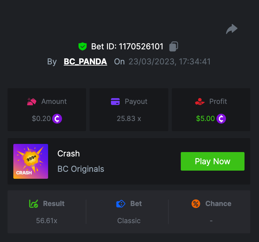 $5k Prestige Crash Challenge #93 DURATION: 16th JUNE - 23rd JUNE 10:00 am UTC Dear valued VIPs, we are delighted to have you back for another thrilling week of challenges and excitement. Brace yourselves for the highly anticipated Prestige Challenge, where you will put your Crash skills to the ultimate test. This week's tournament will revolve around achieving the highest multipliers, promising an adrenaline-pumping experience like no other. With straightforward rules and an incredibly enticing prize pool, we assure you that the stakes are higher than ever. Without further delay, let us immerse ourselves in this extraordinary event. Please review the provided terms and conditions carefully: What's the Challenge? Win the highest multiplier you can on BC.Game's in-house game, Crash. If there is a tie, the player with the higher average bet amount (in USD) shall be the winner. If there is a tie in the amount and payout, the one who posted or edited his post first will be considered in the Ranking. How to Enter To enter, copy the link of the bet you'd like to submit. Once you've copied it, paste it as a reply to this thread like so: Link: https://bc.game/#/sd/1161RODDK14GLV In the same post, upload a screenshot of your win by clicking the game ID WITH VIEW IN USD mode ENABLED (accessible at the bottom of dropdown menu for your wallet up top. This way, we can ensure that your bet indeed met the minimum requirement at the time of placing it: Link: https://bc.game/#/sd/1161RODDK14GLV Minimum VIP Minimum VIP 4 with phone verified will be eligible! Minimum Payouts Minimum payout to qualify is 20x Minimum Bet Size $0.2 USD equivalent Eligible Coins All cryptocurrencies are eligible (excepting JB) Available Prizes GENERAL TERMS Please combine all of your hits together in a SINGLE post. Edit your existing post for additional hits, don't create a new post. Each eligible entry must have the Bet Slip URL, failure to include it will disqualify participation in the event. Bet Slip image is not mandatory. Bets must be posted within 24 hours of placing bet in order to keep things fair for everyone. Bets must be made during the specified time window stated above. This thread will lock automatically when the time period is over. One (1) entry per household. Anyone found attempting to win multiple prizes will be disqualified from this challenge as well as all future challenges. Failure to follow instructions will result in your submission being null and void. By entering this challenge, you acknowledge that BC.Game has the final decision on results and placement. Payouts will be distributed after the event is finished. Please note that it could take anywhere between 24 hours to 7 days after the completion of the event.