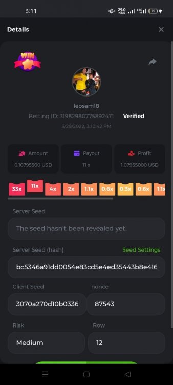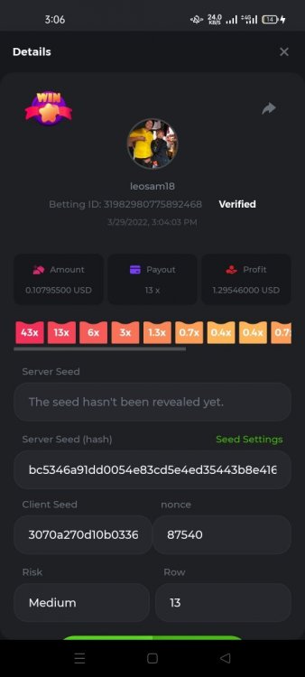Minimum Bet :. $0.05 cents and in High mode risk with 16 row.