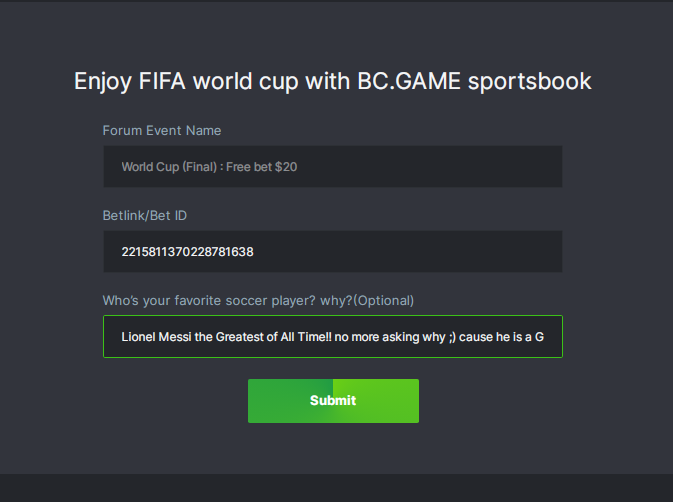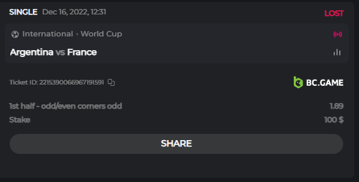 Ticket ID: 2215390066967191591 should had bet on the Argentina XD sucks one game only and dead. anyway thank you for the wonderful promotion Bc.game