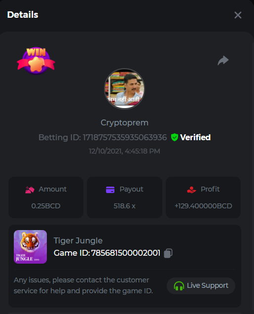 14. Betting ID: 1718757535935063936 Tiger jungle 518.60x