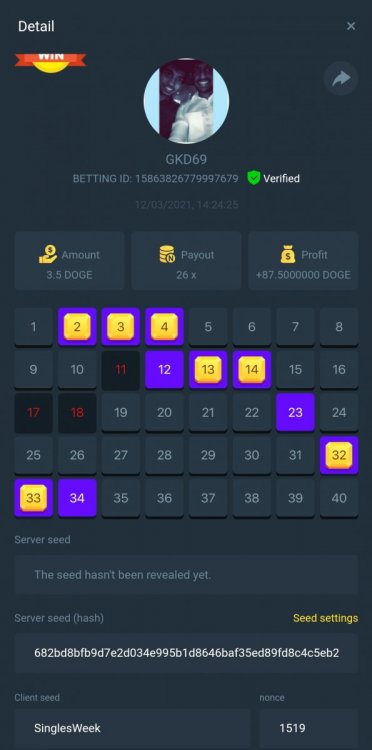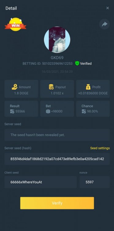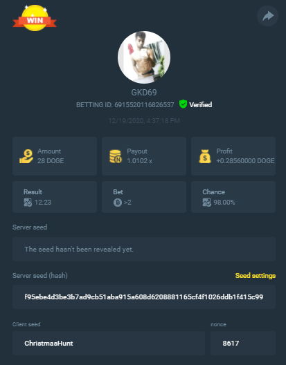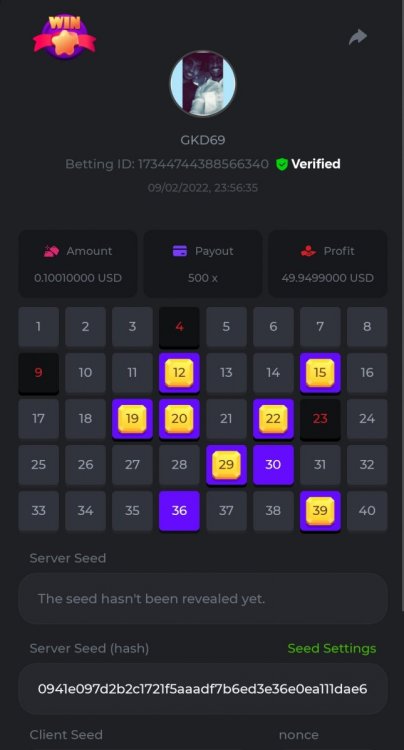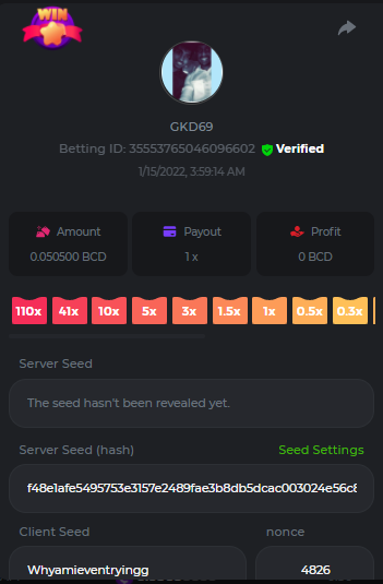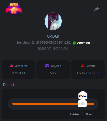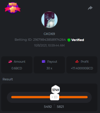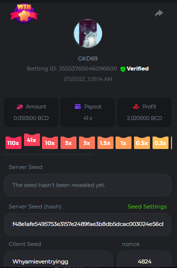 6. Bet ID: #21679843858974155 (10x) Bet ID: #21679843858974180 (20x) Bet ID: #21679843858974264 (30x) Bet ID: #21679843858974285 (40x - Not sure why it always shows me only 39.9193x O.o) Bet ID: #21679843858974292 (50x)