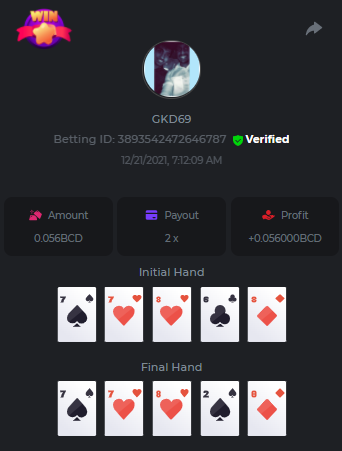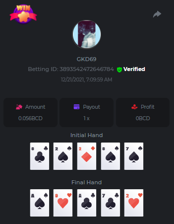 5. Betting ID: 4689516 (14 cards) https://bcgame-project.github.io/bcgame-blackjack/?s=YYOvj4oS%2FeLYG4tUhexnTsvIoj3ZEmAdggATvQi9Z3YEncIAbhfpyw1Q5kfB3njzOp55Ni9I53TONExCvl8Wh8sPK5PjDKpUcmtf2JWeGgrek38pxp1XVxuyB7PIq6%2FEMZh6qgLVUNZYTS3eZPcOUC0U2rc1YLWPBsSgP57nZMQ%3D&i=222768&range=127,141 ____________________________________________________________________________________________________ Betting ID: 4615658 (14 cards) https://bcgame-project.github.io/bcgame-blackjack/?s=lICcvpFFS9u%2BNgYd5yue6RN3tDUpgPdRnwerVoLeM06H8yTxmw5vvpXVpdzF7RjT%2Fh5MXTEwrdzl7CyC6rZ3y0Spf3mJ%2FlsPQqoRd2MT1NAct4FGI9H31aOGI0Lx85Wi70N4TYe1pS0Jrhyf5O8a%2B6uoNl67dsEY8z%2FTCYq9%2Bjw%3D&i=221653&range=237,251 Adding another entry cus im not sure if its eligible, however the bet is 1.25x and so it is a win technically. @digitaldash any further information about various payouts would be great, cus in BJ with insurance, splits etc the payouts could vary. ____________________________________________________________________________________________________ MASTER BONUS COMPLETED Betting ID: 4661357 (Player - 2,3,4,5,6) https://bcgame-project.github.io/bcgame-blackjack/?s=R6TLzK7mddp59iehua2Mu8Ey26Pv7MvpHXJUciGx1okbhSFQ3ZGYvJz0f%2FSQX0jxEQAWELPpD1Dgb2o7dYaEYikuSudEDMkptn0kboQoXyBQh2872kY7Z5QurjcR0tb6UKn8zfSwqeMQWZtysIwhrx1z955mrBYZDKZ3XfjCBZU%3D&i=222338&range=163,172