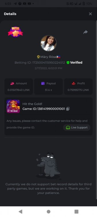 Hit the gold Betting ID: 1725004115950224512 Golden dancing lion Betting ID: 1725003185519685127 Tiger jungle Betting ID: 1725004843980165760 Solar queen Betting ID: 1725007278543917063