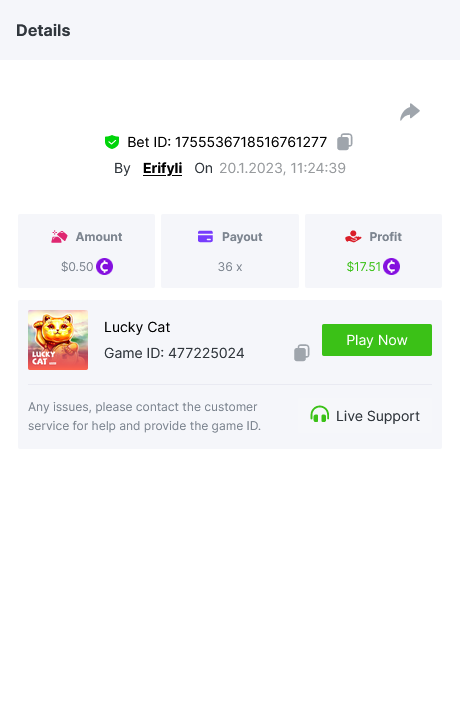 Bounty ? https://bc.game/#/sd/1123A7FXI98S9F The exact amount paid in the game was 50x but the multi shown is 0.05 higher than in reality. Not sure if this counts as bounty. https://bc.game/#/sd/1123L1X3SF7YTV https://bc.game/#/sd/111XF58ISYZR4J https://bc.game/#/sd/111X8MPZ776SYB https://bc.game/#/sd/111XAGX5V8YMMR https://bc.game/#/sd/1121WOEHI0AT5F https://bc.game/#/sd/111XKLL6U67THV