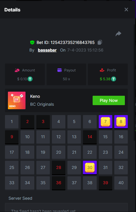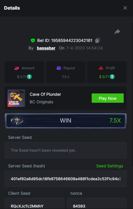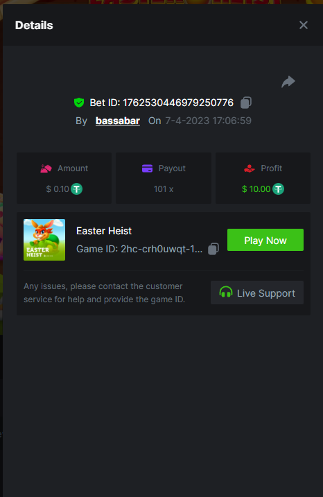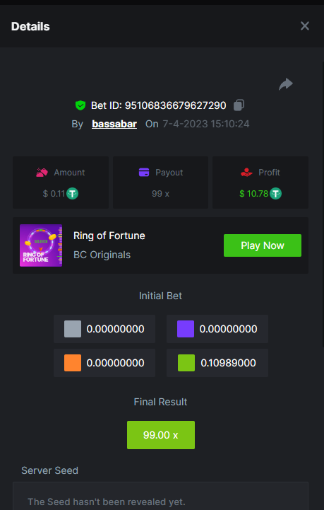 19. So it's just who place the highest bet on a single 12x win? Not consecutive wins or something? 12x https://bc.game/#/sd/114VKR7ICKMGPF Bounty (Tie, all red) https://bc.game/#/sd/114LUSQGPLD9G3