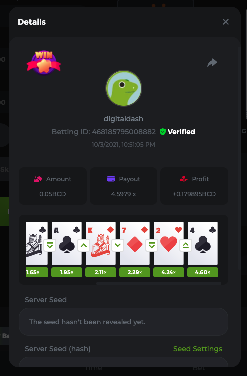 Starts: 0:00, October 12 GMT Ends: 0:00, October 19 GMT Welcome back VIPs! This week's challenge game is our in-house Blackjack . What's the Challenge? Draw as many cards as possible without going over 21 for both dealer and player. In this example, the total would be 8 points, as there were a total of 8 cards drawn. Each card counts as 1 point. If there is a tie, the player with the higher average bet amount (in USD) shall be the winner. Splitting is allowed. Must be a WINNING bet. Minimum VIP Tier Must be VIP08 or higher in order to enter this challenge. Minimum Bet Size $0.50 USD equivalent (please check the individual coin amounts below) - Bets made below this amount will not count. Eligible Coins All coins are eligible (excluding JB) Available Prizes 1st Place....,.. $1,250 2nd Place..... $600 3rd Place...... $300 4th-20th ...... $50 /ea How to Enter To enter, copy the bet ID of the bet you'd like to submit Once you've copied it, post it as a reply to this thread like so: Betting ID: 1708854428417660423 In the same post, upload a screenshot of your win by clicking the game ID WITH VIEW IN USD mode ENABLED (accessible at the bottom of dropdown menu for your wallet up top. This way, we can ensure that your bet indeed met the minimum requirement at the time of placing it: ADDITIONALLY, YOU MUST COPY+PASTE THE VERIFICATION LINK BY CLICKING ON THE VERIFY BUTTON Please combine all of your hits together in a SINGLE post. Edit your existing post for additional hits, don't create a new post. Bets must be posted within 24 hours of placing bet in order to keep things fair for everyone. Bets must be made during the specified time window stated above. This thread will lock automatically when the time period is over. One (1) entry per household. Anyone found attempting to win multiple prizes will be disqualified from this challenge as well as all future challenges. Furthermore, you will go on the WALL OF SHAME for all to see that you are a scam. Scam 4 Scam. Failure to follow instructions will result in your submission being null and void. By entering this challenge, you acknowledge that BC.Game has the final decision on results and placement. Payouts will be made within 48 hours of challenge completion, please be patient, we promise you that we haven't forgotten. We check and double check to make sure the rightful winners receive their prize. Don't die. Dying constitutes as a withdrawal from the challenge on the players end, meaning you're disqualified. So you should most likely wait until after the challenge is over. Or just don't. Good luck to everyone, look forward to seeing who comes out on top this week! MASTER BONUS - Win a round with the cards 2, 3, 4, 5, 6 drawn for either side to win a guaranteed $100 regardless of podium placement! Cards do not have to be drawn in order, must be exactly the 5 cards stated above to count for either player or dealer (not combined), no more no less. Must be a WINNING bet. Minimum bet still applies fo this bonus.