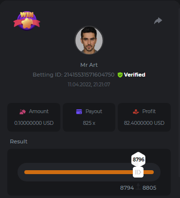 $1k Prestige Crash Challenge #7 Hello everyone. We are pleased to announce this week's challenge available for any VIP levels at BC.Game. Let’s see who can get the highest multiplier on our Crash, the total prize pool is $1,000. What's the Challenge? Win the highest multiplier you can on in-house Crash. In case of a tie, the winner will be a player with a higher bet amount. Minimum VIP There's no minimum VIP level Minimum Payout Minimum payout to qualify is 20x Minimum Bet Size $0.05 USD equivalent Eligible Coins All coins are eligible (excepting JB) Available Prizes 1st Place....... $400 2nd Place..... $200 3rd Place...... $100 4th Place......$50 5th-10th.........$40 How to Enter To enter, copy the bet ID of the bet you'd like to submit. Once you've copied it, post it as a reply to this thread like so: Betting ID: 662816411 In the same post, upload a screenshot of your win by clicking the game ID WITH VIEW IN USD mode ENABLED (accessible at the bottom of dropdown menu for your wallet up top. This way, we can ensure that your bet indeed met the minimum requirement at the time of placing it: Please combine all of your hits together in a SINGLE post. Edit your existing post for additional hits, don't create a new post. Bets must be posted within 24 hours of placing bet in order to keep things fair for everyone. Bets must be made during the specified time window stated above. This thread will lock automatically when the time period is over. One (1) entry per household. Anyone found attempting to win multiple prizes will be disqualified from this challenge as well as all future challenges. Failure to follow instructions will result in your submission being null and void. By entering this challenge, you acknowledge that BC.Game has the final decision on results and placement. Payouts will be made within 72 hours of challenge completion, please be patient, we promise you that we haven't forgotten. We check and double check to make sure the rightful winners receive their prize. Prizes will be paid out in BCD. Good luck to all participants