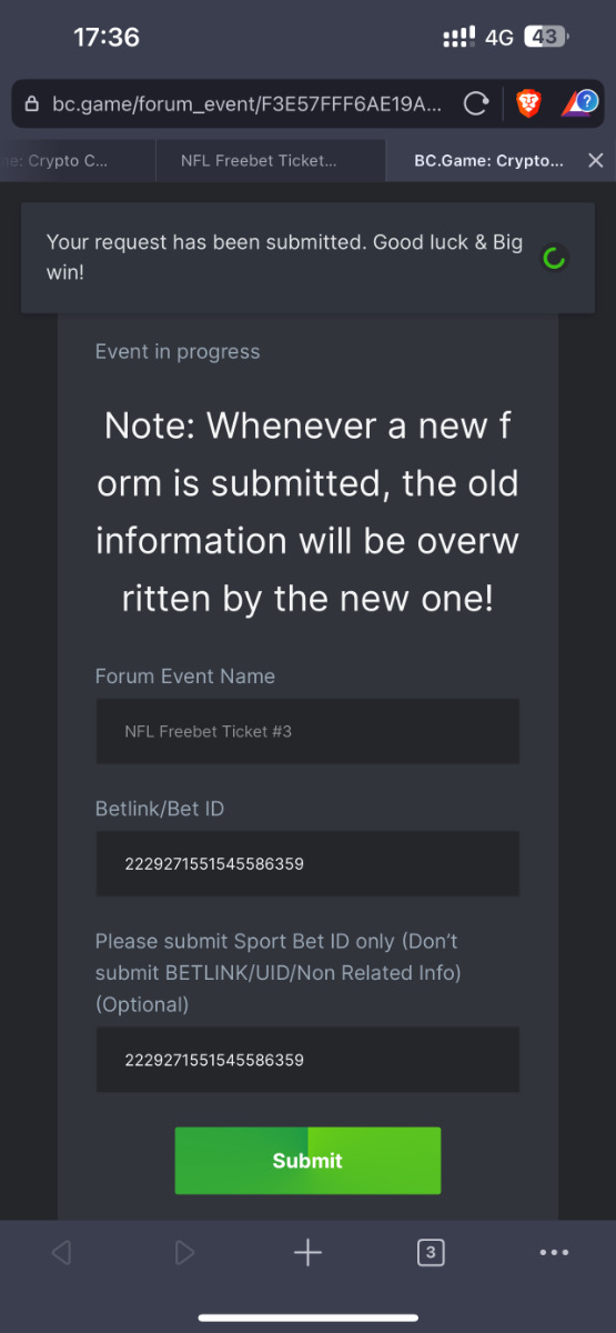 BCGAME_Bil Posted January 23, 2023 Share Posted January 23, 2023 Grab your NFL free bet ticket up to $20 now !!! ________________ Starts: 23, Jan 00:00 AM UTC Ends: 1, Feb 23:59 PM UTC Hey BC Players! A freebet ticket is coming! Don’t miss it This time, we provided a free bet ticket up to $20 to all users who bet on the NFL-selected match, “Kansas City Chiefs VS Cincinnati Bengals“, limited to the first 300 slots !!! First come, first serve based. Rules: Place a bet on any pre-match bet type within the selected NFL match. Only one(1) single bet per person is accepted. Bet result with “lost” is valid to submit the sports ticket id. (Half lost/Cash-out are non-acceptable) Using a Free bet ticket to enter this event is non-acceptable. Form submitting once(1 time) will do; either the latest submitted information will overwrite the old information and cause limited slots taken by other users. Single bets only - Multis & Combo parlays are not acceptable. Hedging is strictly not allowed. Free bet tickets will distribute within 48 hours to the first "300 qualified users.” after the end of the event time frame. Free bet ticket amount based on your eligible sports bet ID amount, up to $20. Example: Prof.Bil makes a bet on “Kansas City Chiefs VS Cincinnati Bengals” with $15, the result is “LOST,” and Prof.Bil was one of 300 limited slots. Prof.Bil will earn a free bet ticket valued at $15. ___________________________________________________________________________________________ Selected Match Kansas City Chiefs VS Cincinnati Bengals Game Time Game Time: 22 Jan, 23:30 PM UTC+0 Magic link ___________________________________________________________________________________________ Minimum VIP Minimum VIP 1 Level and above. Minimum Odds requirement Minimum odds 1.5 (European) and above. Minimum bet size Equivalent to US $1 Bet type Any Pre-match Bet Type with “LOST" outcome Live/Pre-match Pre-match only Eligible currenciesAll cryptocurrencies are eligible (except JB,BCL) All fiat is eligible How to Participate : Click here to submit your sportsbook valid ticket id. In case you need the URL for submitting your entry: https://bc.game/forum_event/F3E57FFF6AE19A46 Please submit the correct sports bet ticket ID. Forms are editable within the event time frame. For any amendments, please resubmit your forms with the link above. Example for "Form submitted” reference : Sports Bet ID: 2178076114965115642 ___________________________________________________________________________________________ Freebet Detail Free bet ticket will be issued to the correct sports ticket id owner. Free bet will be expired within 30 days once granted. Please activate it asap. After activation, please use it as soon as possible. Activated free bets will be expired within 30 days. Any wrong ticket id submitted, or missed of free bet activated period, will not be re-issued the free bet ticket. Free bet ticket odd limitation in between 2.0 - 4.0. Free bet ticket can be placed in any of the sportsbook matches. Free bet ticket will be granted in the “BCD" view for prior. Free bet ticket with a “won" result. The stake will not return; only the profit amount will be issued back to the account. ___________________________________________________________________________________________ The ticket ID will not be counted if the selection results in a void or postponement. If the selection match is canceled or postponement, the round of this event will be canceled. Cashed-out bets are not eligible. Hedging is strictly not allowed. Create a SINGLE post. If you get a better result, edit your existing post, and don't create a new post. Bets must be placed & settled during the time window specified above. This thread will automatically lock when the time period ends. One (1) entry per family. If someone attempts to claim multiple prizes, they will be disqualified from the challenge as well as all future challenges. This may also result in account termination. Failure to follow the instructions will result in the cancellation of your submission. By entering this challenge, you acknowledge that BC.GAME has final decision rights over results and placement. Freebet tickets will be paid within 48 hours after the event finishes. Link to comment Share on other sites More sharing options...