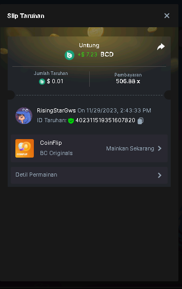 Moderator Giandreas Posted November 29, 2023 Moderator Share Posted November 29, 2023 Read Carefully Before Start To Hunt Forum Daily Challenges #433Hunt : CoinFlip Win the highest pay out Min Payout : series 5 Min Level 4️Duration Starting : Now End time : 23.59 UTC Time How to Join? Make screenshot + paste your bet link + UID or Profile link Any coin, with min bet 0.01 USD is allowed (jb/bb/bcl not allowed)Reward Prizes 1st Place.....$7 BCD 2nd Place.....$5 BCD 3rd Place.....$4 BCD 4th Place.....$3 BCD 5th Place.....$2 BCD 🏵 Winners will be announcing next day after Roll Point! Link to comment Share on other sites More sharing options...