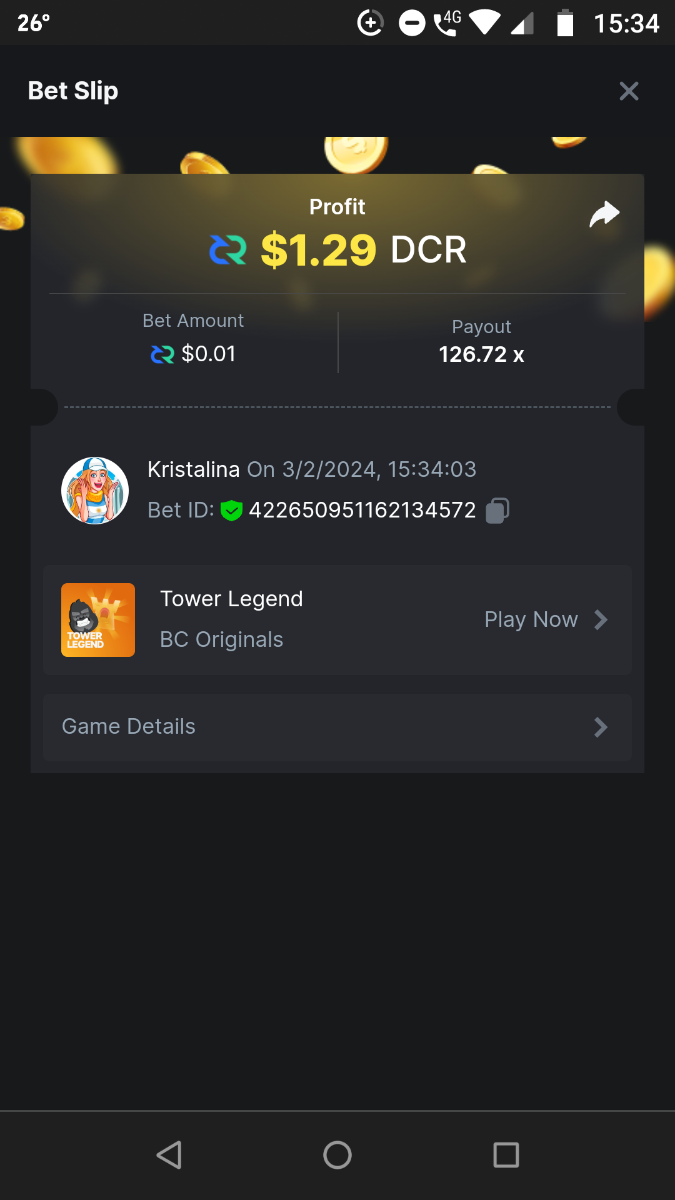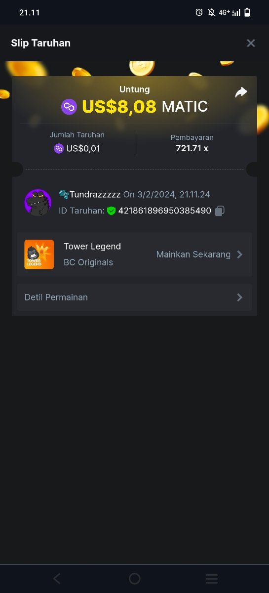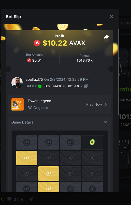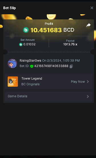 Moderator Giandreas Posted February 3, 2024 Moderator Share Posted February 3, 2024 Read Carefully Before Start To Hunt Forum Daily Challenges #499Hunt : Tower Legend Win the highest pay out Min Payout : x13 Min Level 10 ️Duration Starting : Now End time : 23.59 UTC Time How to Join? Make screenshot + paste your bet link + UID or Profile link Any coin, with min bet 0.01 USD is allowed (jb/bb/bcl not allowed) Reward Prizes 1st Place.....$7 BCD 2nd Place.....$5 BCD 3rd Place.....$4 BCD 4th Place.....$3 BCD 5th Place.....$2 BCD 🏵 Winners will be announcing next day after Roll Point! Link to comment Share on other sites More sharing options...