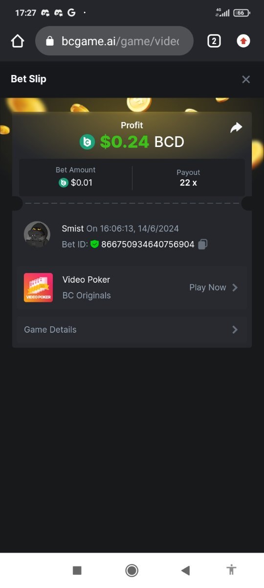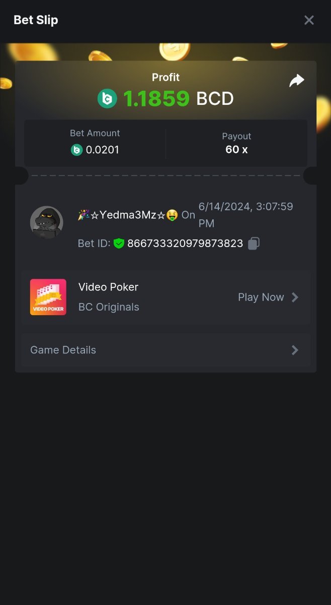 Moderator Giandreas Posted June 14, 2024 Moderator Share Posted June 14, 2024 Read Carefully Before Start To Hunt Forum Daily Challenges #631Hunt : VIdeo poker Win the highest pay out Min Payout : 9x Min Level 10️Duration Starting : Now End time : 23.59 UTC Time How to Join? Make screenshot + paste your bet link + UID or Profile link Any coin, with min bet 0.01 USD is allowed (jb/bb/bcl not allowed)Reward Prizes 1st Place.....$7 BCD 2nd Place.....$5 BCD 3rd Place.....$4 BCD 4th Place.....$3 BCD 5th Place.....$2 BCD 🏵 Winners will be announcing next day after Roll Point! 1 Link to comment Share on other sites More sharing options...