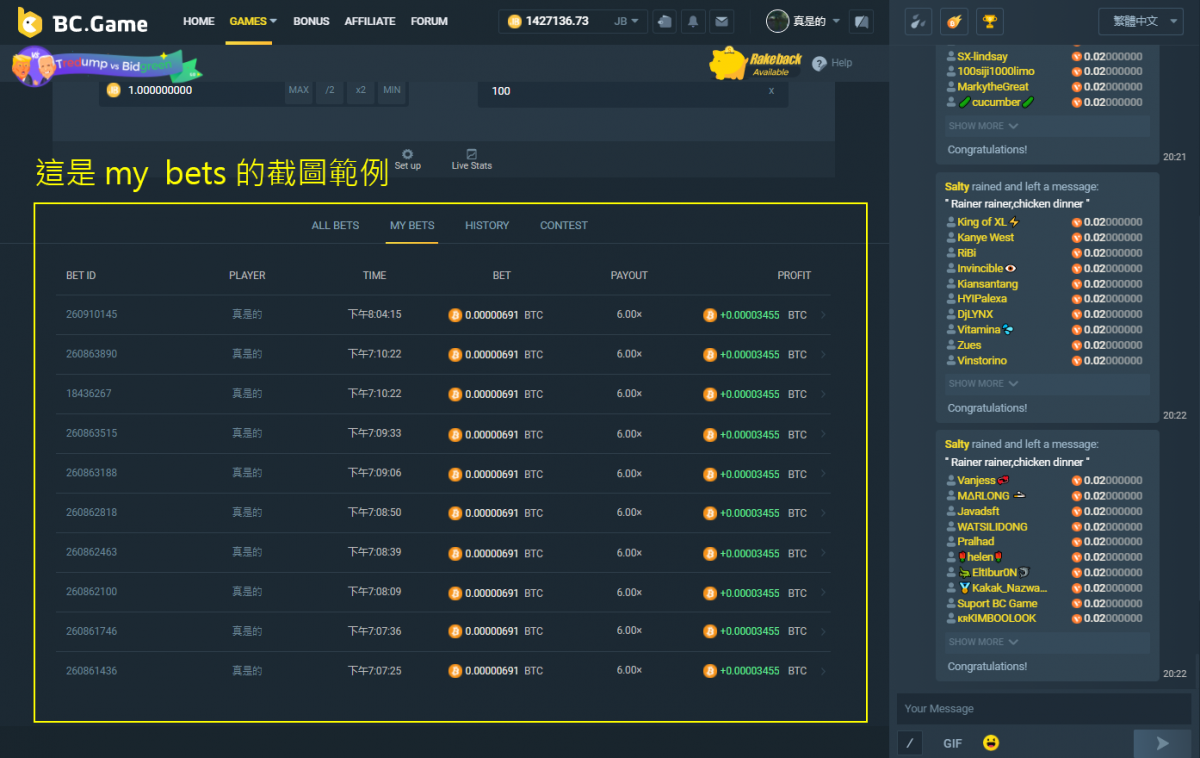 真是的 Posted October 20, 2020 Share Posted October 20, 2020 華人爆點挑戰 目標: * 從爆點 2967777 期(含) 活動開始。 * 玩爆點 classic 或 trenball 連續贏 10 場(含)以上。(game-id 連續不中斷) * 最低下注金額請參考下表,最低逃跑倍數 1.6x (含)以上。 名額: 3 個名額、每人獎金 0.0333 ETH。 資格: 玩家需活躍於中文聊天室、並且是大家熟知的中文玩家。(突然冒出來沒人認識的帳號、或長期不參與中文聊天的帳號皆不符資格) 條件: 達成目標的玩家在底下回覆文章、並貼上你的 my bets 畫面完整截圖、以及寫下你連贏的 game-id 範圍。 規則: 取前三名達成目標並回覆文章的玩家給予獎金,獎金會在活動結束並驗證無誤後發出。 累積滿三名得獎者、活動即結束。 若未滿三個名額、活動將於台北時間 2020/10/21 12:00 結束,未發出的獎金留待下次活動使用。 貼文範例: GAME-ID 範圍 2967543~2967553 Link to comment Share on other sites More sharing options...
