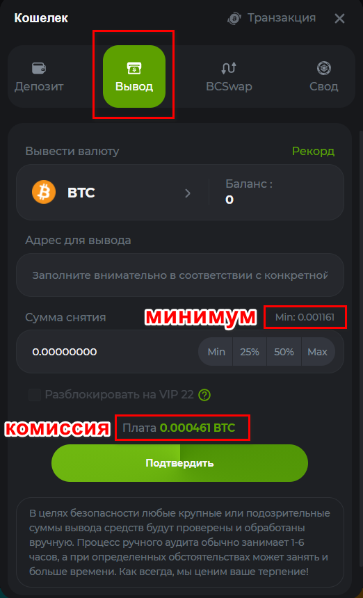 Вывод крипты как в ручном так и в автоматическом режиме от 1 минуты до 24 часов. В ручную выводят крупные суммы и занимает это чуть больше времени, поскольку сначала проверяют на отсутствие ошибок и предпосылок к мошенничеству. Т.Е. были ли монеты выиграны или получены от других пользователей. Как то так.