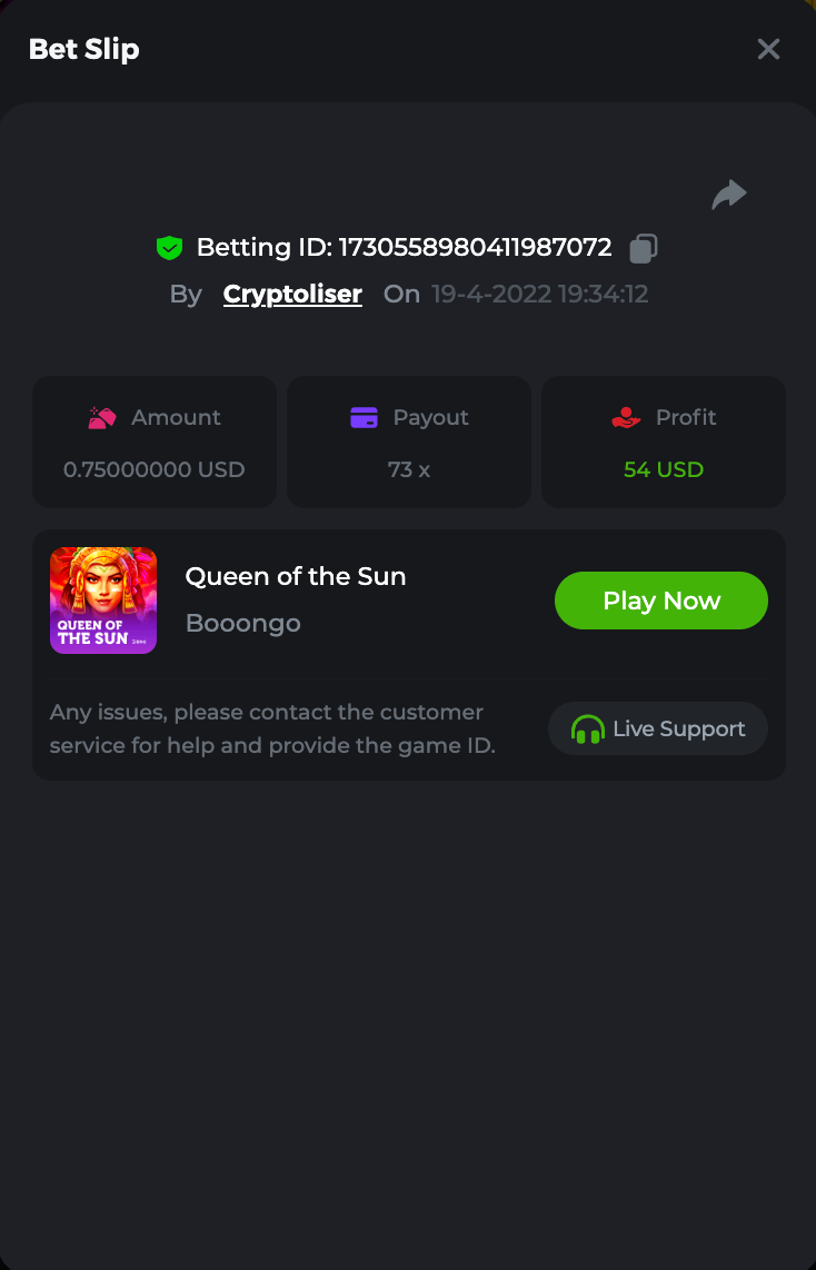 • In the same post, upload a screenshot of your win by clicking the game ID WITH VIEW IN USD mode ENABLED (accessible at the bottom of dropdown menu for your wallet up top, and Submit Reply. Done! This way, we can ensure that your bet indeed met the minimum requirement at the time of placing it: