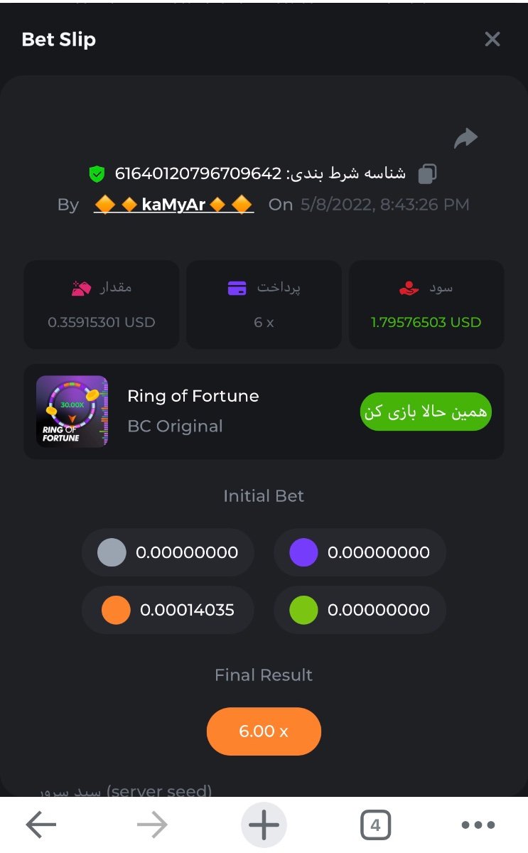 Eric-bc-love Posted May 4, 2022 Share Posted May 4, 2022 (edited) سلام به دوستان عزیز Ring Of Fortune | چالش : کسب حداڪثر ضرایب پیاپی در بازی حلقه ثروت چالش این هفتہ بہ این شکل مے باشد ڪہ ڪاربران باید بیشترین تعداد ضریب 6 ایڪس پیاپی را ڪسب ڪرده و به اشتراڪ بگذارند . مجموع ضرایب 6 ایڪس متوالی به عنوان امتیاز نہایے ڪاربر در نظر گرفتہ خواهد شد . هر ڪاربر 1 بار مجاز به ارسال شات و ثبت ریپلای مے باشند مثال : https://bc.game/sd/?sd=10K3GRXJUA0G0J https://bc.game/sd/?sd=10K3GTGFDMM32R https://bc.game/sd/?sd=10K3GU8D6QRJ0Z شرایط شرڪت در چالش حداقل پایه شرط : مینیموم تمامی ارزها به جز جی بی حداقل لول ڪاربر : ندارد نڪات بسیار مهم : دوستان دقت ڪنید ڪہ ارسال لینڪ تمام شرطهایی ڪہ در شات اسڪرین ارسالے شما مشاهده مےشود، الزامے مے باشد و همچنین از ادیت ڪردن ریپلای خودداری ڪنید . ریپلای هایے ڪہ ادیت شده باشند حذف شده و فرصت شما را از بین خواهد برد . پس نہایت دقت رو در هنگام اشتراڪ شرطهاے خودتون داشتہ باشید در مثال بالا من 3 ضریب 6 ایڪس گرفتم ڪہ 18 امتیاز برای من لحاظ میشہ . دوستان عزیز دقت ڪنید ڪہ ڪمترین تعداد توالی 3 ضریب می باشد . در صورت تساوی امتیازات دو ڪاربر ، امتیازاتے ڪہ پایہ شرط بالاترے (اولین شرط) از نظر دلاری داشتہ باشند در جایگاه بالاترے قرار خواهند گرفت و اگر از نظر دلاری هم برابر باشند زمان ارسال شرط ، ملاڪ سنجش خواهد بود جوایز نفر اول : 35 دلار نفر دوم : 15 دلار نفر سوم : 8 دلار نفرچهارم تا هفتم : نفری 3 دلار زمان پایان چالش : سہ شنبه 20 اردیبہشت / ساعت 23:59 لینڪ ڪانال چالش های انجمن و آموزشے : https://t.me/forumchallenge موفق و پرسود باشید ❤ Edited May 8, 2022 by Eric-bc-love 3 Link to comment Share on other sites More sharing options...